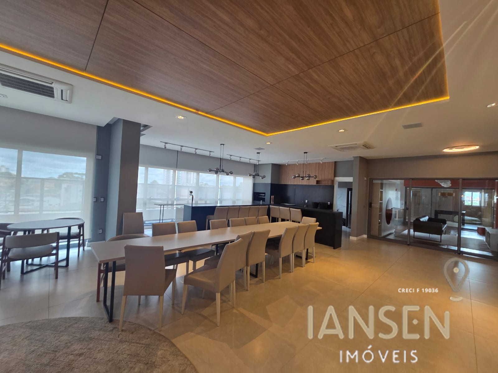 Ampla sala para 3 ambientes, integrada com churrasqueira
